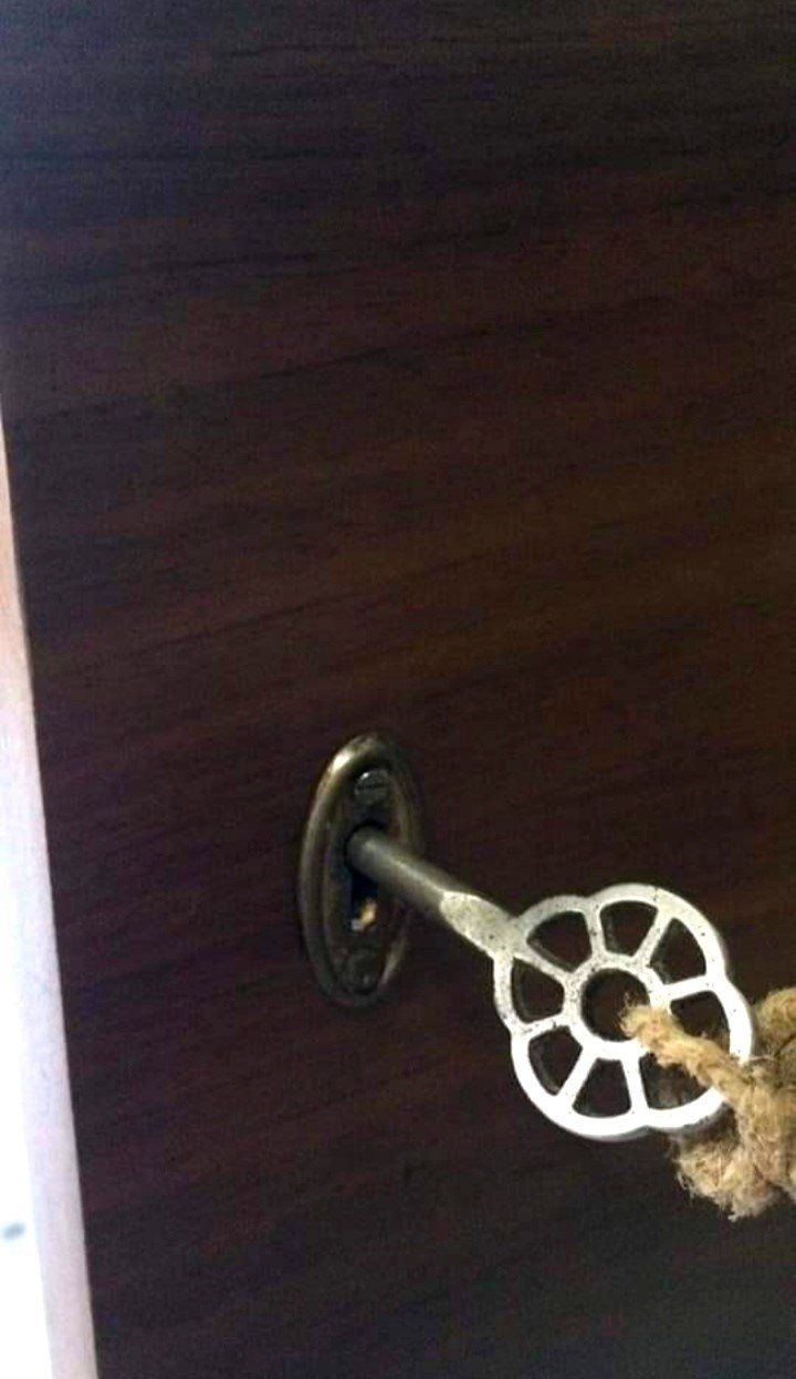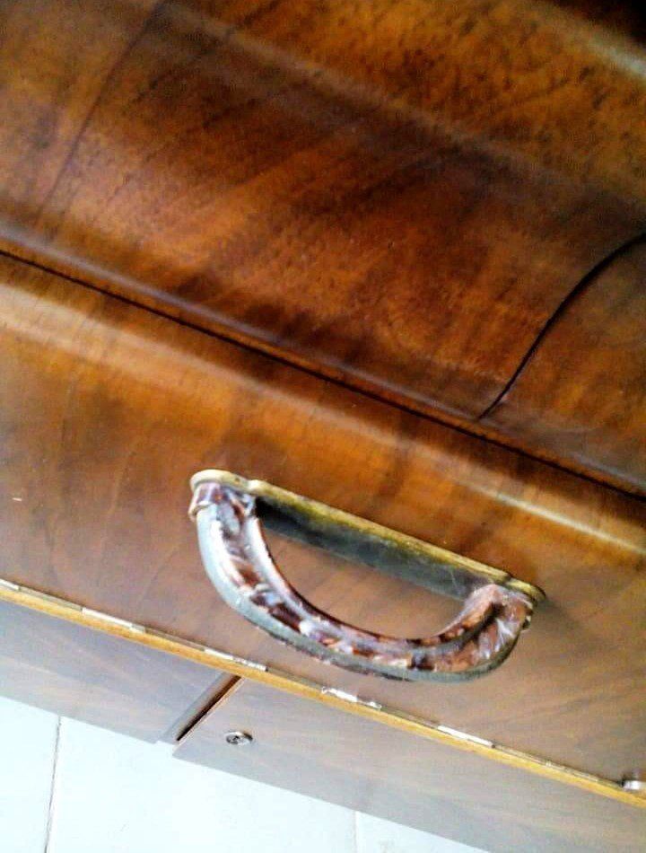 Το στολίζουν εξαιρετικά πόμολα από κόκκαλο, δέρμα και μπρούντζο, όμορφα κλειδάκια μαργαρίτες και μία βιτρίνα στο επάνω μέρος.